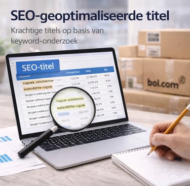 Een sterke listing begint bij een titel die gevonden wordt. Op basis van een uitgebreide keyword analyse brengen we alle relevante zoektermen voor jouw product in kaart. Denk aan zoekvolume, concurrentie, het aantal sales dat nodig is om organisch te ranken en het gemiddeld winnend bod voor Sponsored Products. Op basis van deze data maken we een SEO-geoptimaliseerde titel die maximaal aansluit op het bol.com algoritme en zorgt voor meer zichtbaarheid.